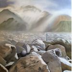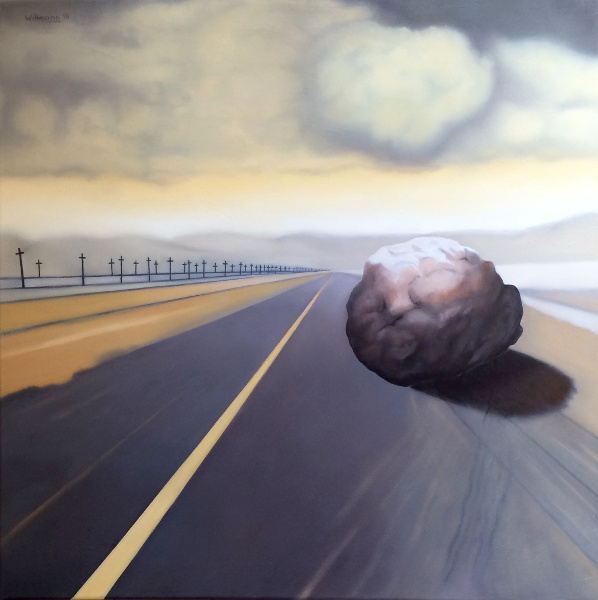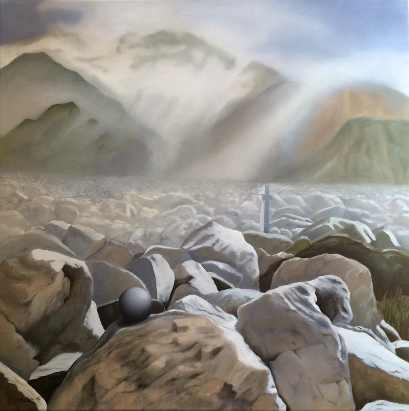 Morgenlandschaft mit Steinen, Kugel und Kreuz, 2015, Öl auf Leinwand, 60 x 60 cm