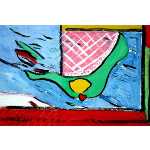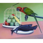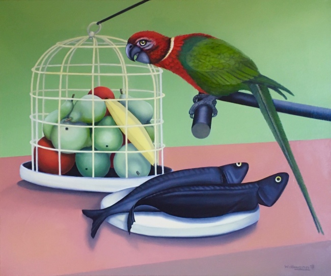 Früchtekäfig und Papagei, 2017, Öl auf Leinwand, 50 x 60cm