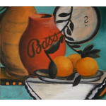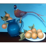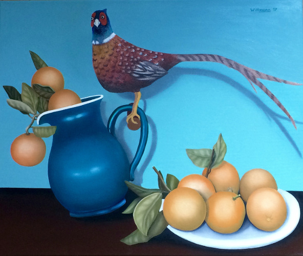 Orangen, Krug und Vogel, 2017, Öl auf Leinwand, 50 x 60 cm