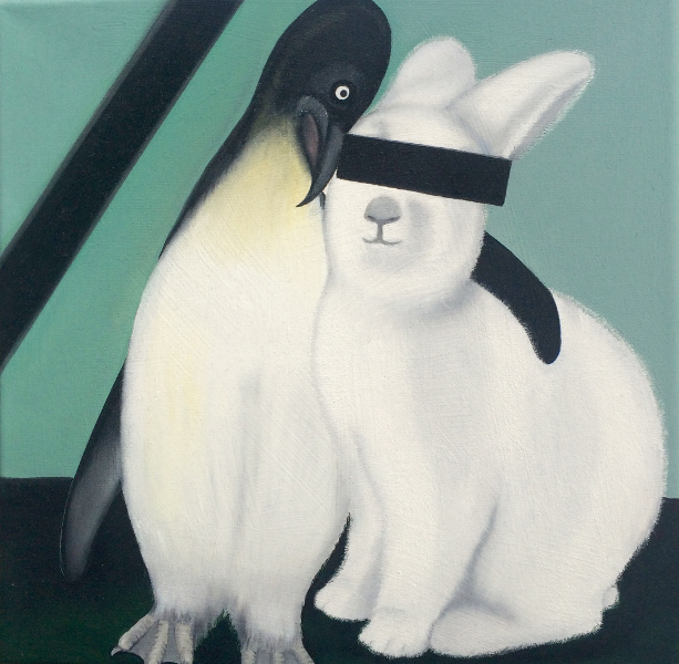 Stillleben mit Stoffhäschen und Pinguin, 2016, Öl auf Leinwand, 30 x 30 cm