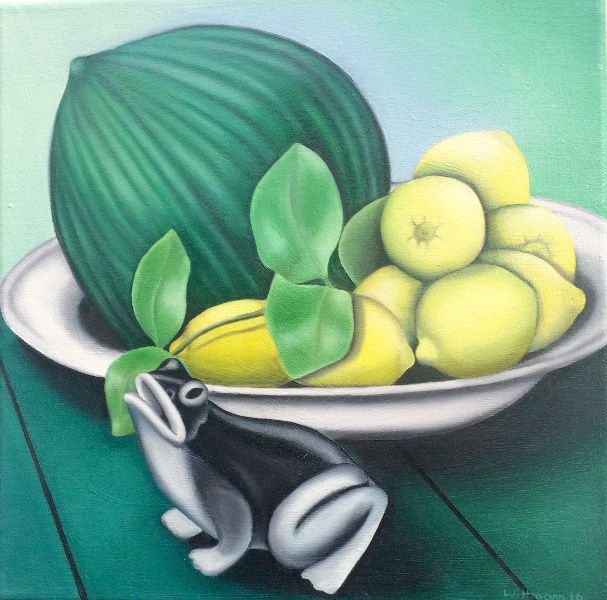 Zitronen und Keramikfrosch, 2016, Öl auf Leinwand, 30 x 30 cm