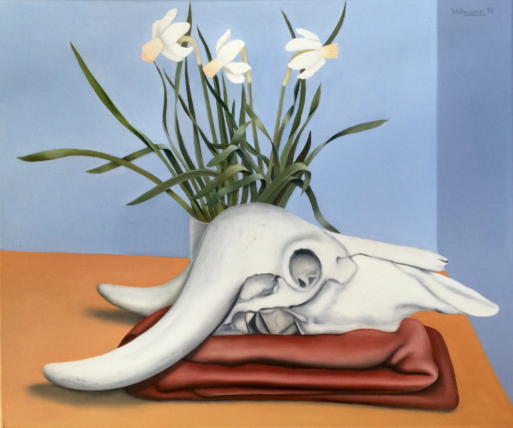 Tierschädel und Narzissen, 2016, Öl auf Leinwand, 50 x 60 cm