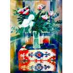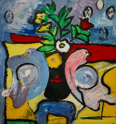 Stillleben mit Tauben und Blumenvase, 2007, Öl auf Karton, 31 x 29 cm